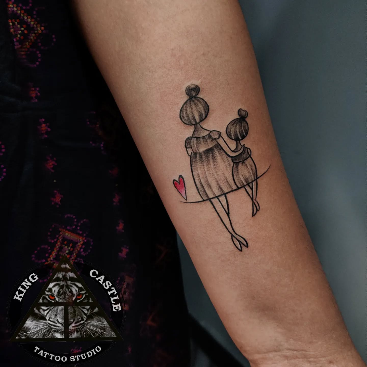 This design shows a mother and daughter sitting side by side, holding hands, with a small red heart symbolizing love. The shading on the dresses adds depth and style, making the tattoo visually appealing.