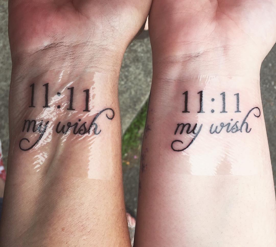 These matching wrist tattoos capture the phrase “11:11 my wish,” which represents hope, dreams, and making a wish at the magical moment. The script lettering gives it an elegant and timeless look.