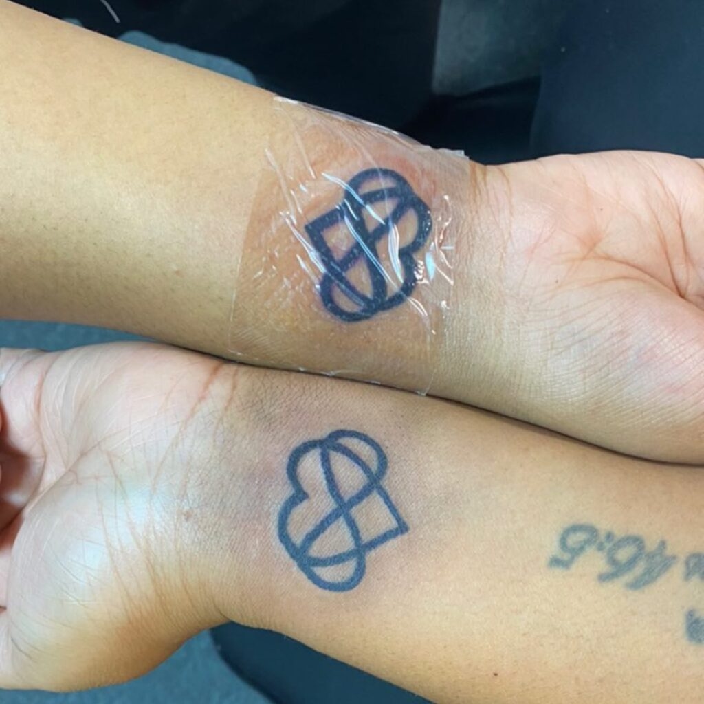 This pair of matching tattoos uses a creative overlapping heart design that looks modern and bold. The simple black ink makes it versatile and easy to match with any style.