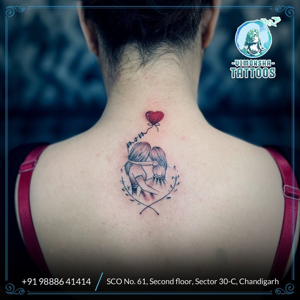 This beautiful back tattoo shows a mother and daughter sharing a warm embrace, surrounded by a heart-shaped leafy frame. Above them floats a red balloon heart with the word “mom” written along its string, adding a sweet and symbolic touch.
