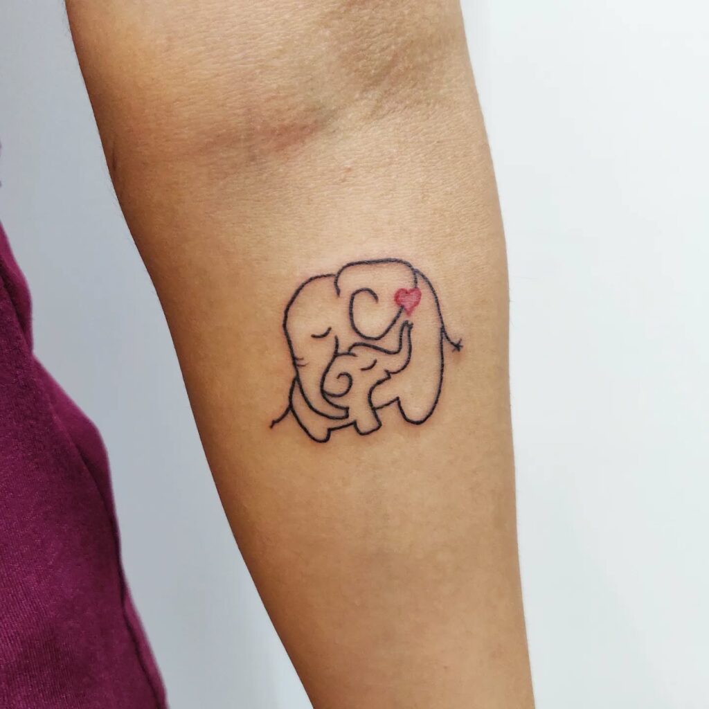 This adorable design features a mother elephant embracing her baby with their trunks forming a heart. The tiny pop of red adds warmth and love to the tattoo.