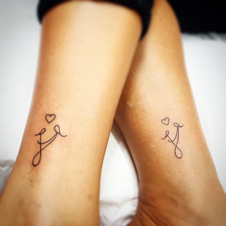 This beautiful matching tattoo design uses delicate linework to create elegant initials joined by a small heart. The placement on the ankle gives it a subtle yet intimate vibe, perfect for a mom and daughter duo who want a meaningful symbol of their bond without going too bold.