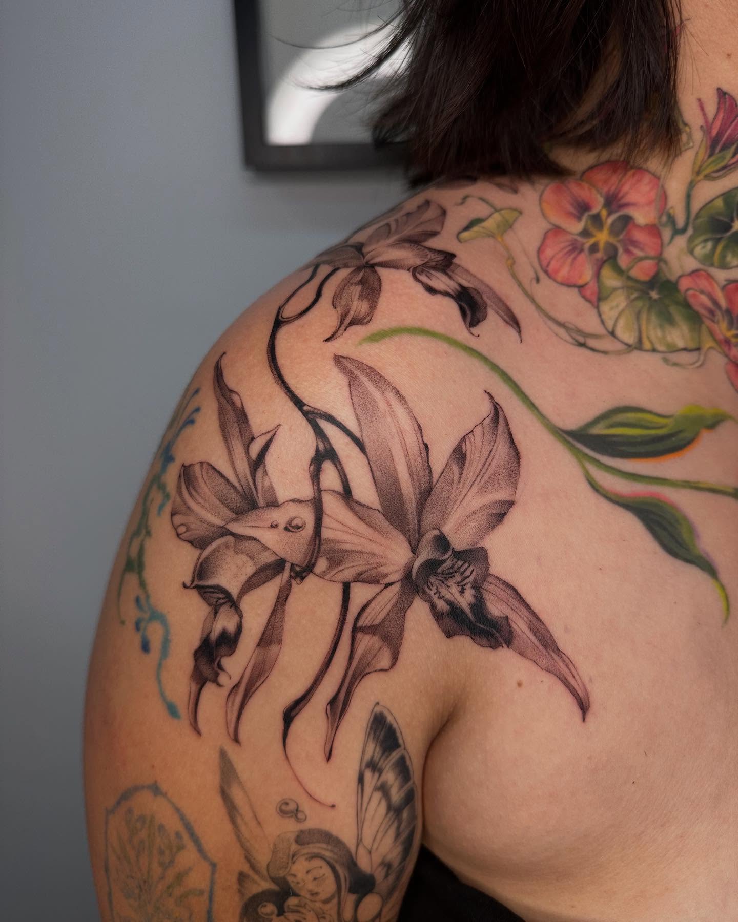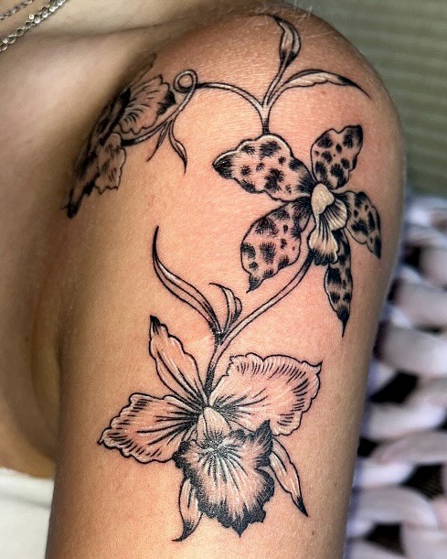 This shoulder tattoo brings orchids to life with intricate patterns on their petals, resembling spotted or speckled varieties. The black and grey shading enhances depth, while fine linework captures the natural curves and elegance of the flowers as they extend outward.