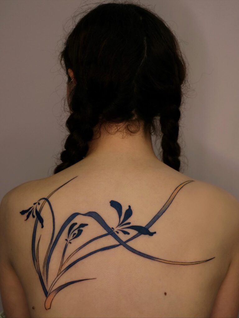 This design uses clean lines and abstract flow to reimagine orchids with a modern touch. Set across the upper back, the tattoo features sleek blue strokes and subtle gradients that form orchids intertwined with long, graceful stems. Its minimalist approach creates a sense of motion and balance across the canvas of the skin.