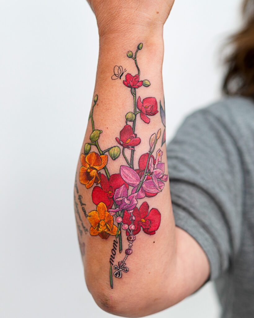 A burst of vibrant reds, oranges, and purples creates a striking cascade of orchids down the forearm. The addition of a rosary and the word “mom” transforms this tattoo into a deeply personal tribute. Small details like the butterfly and gemstone-like beads add symbolic touches of love, spirituality, and transformation.