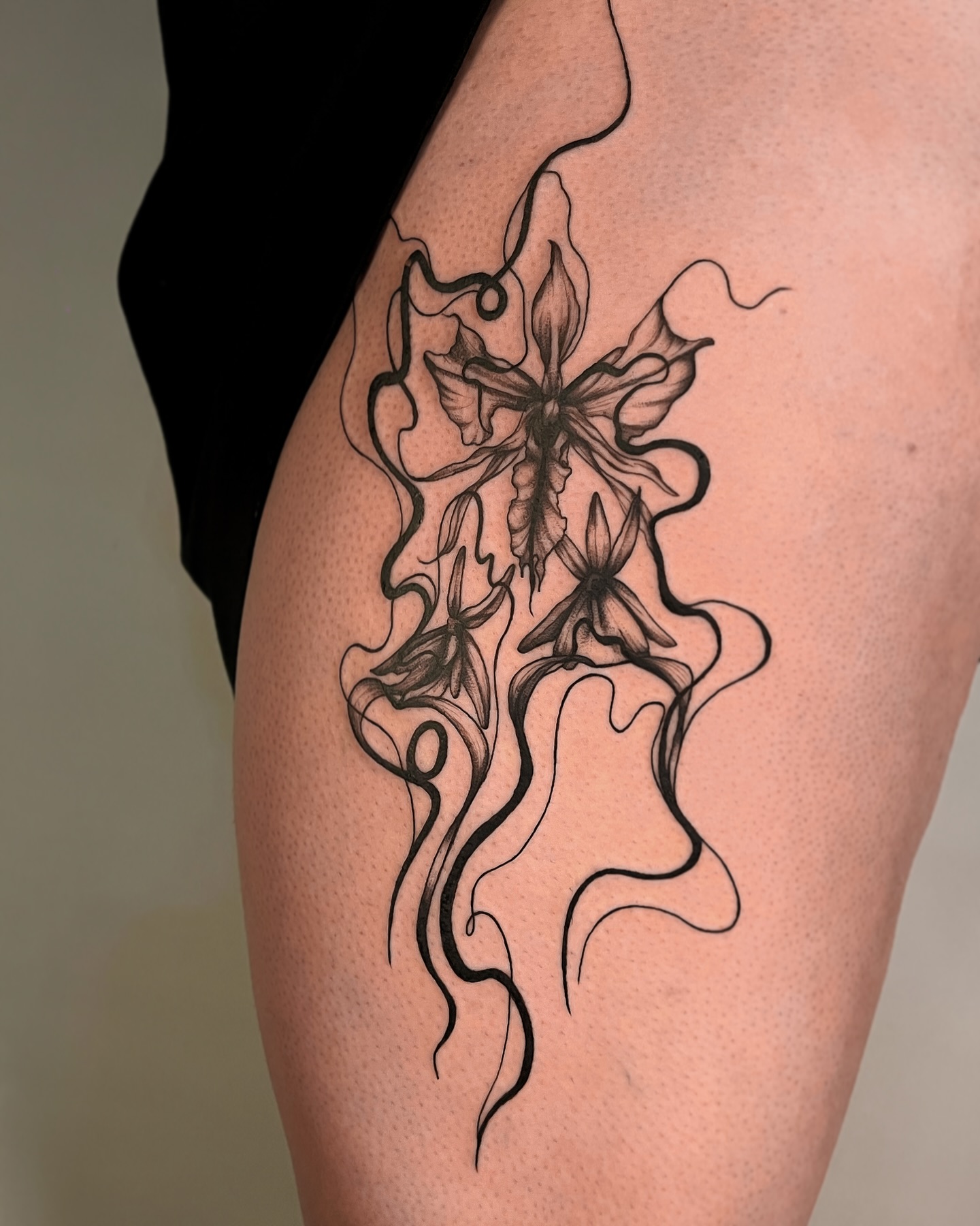 This thigh piece features orchids rendered in fine black linework, framed by swirling, smoky lines that create a sense of energy and flow. The central orchid blooms with stunning detail, while the surrounding blossoms and abstract curves enhance the dynamic movement of the piece.