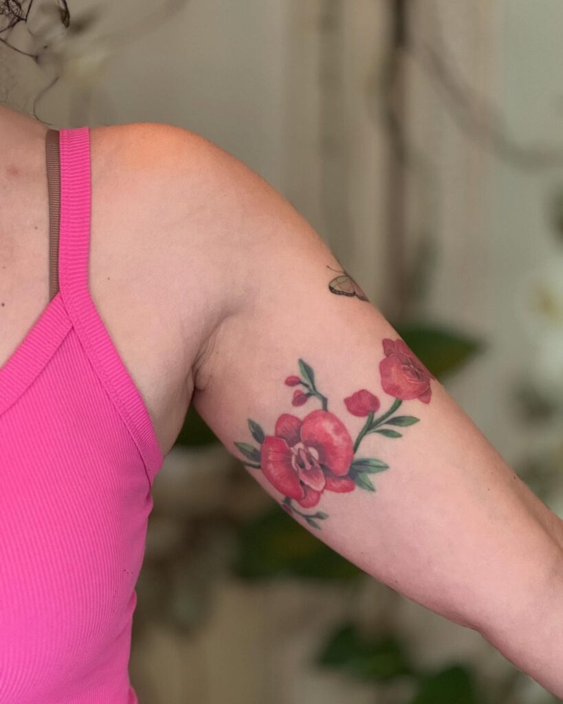 This delicate orchid tattoo blooms gracefully on the upper arm, painted in shades of red with hints of soft green foliage. The blossoms appear fresh and natural, like a watercolor painting brought to life on the skin. Its small cluster design makes it charming without overwhelming the arm.