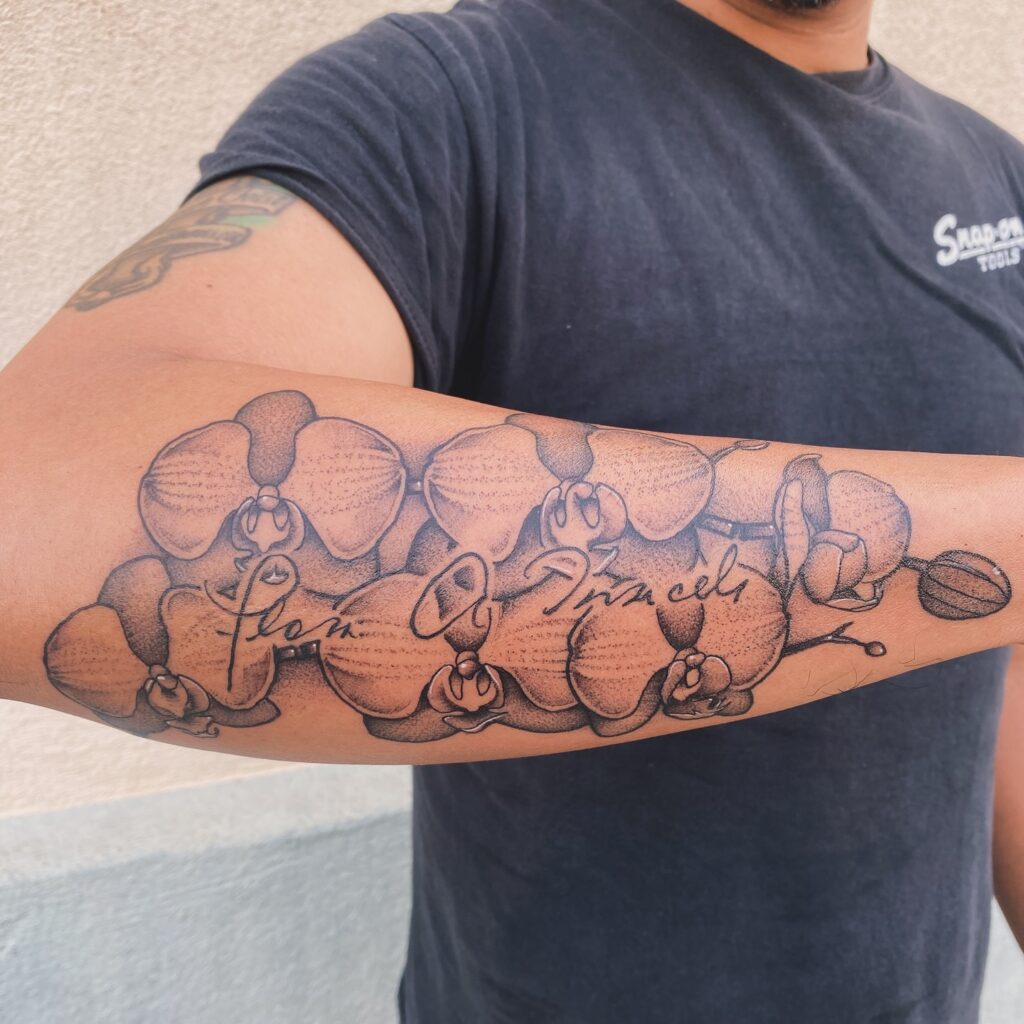 This forearm tattoo presents a chain of orchids in soft black and grey shading, elegantly wrapping along the arm. Intertwined with the blossoms is a flowing script that adds personal meaning, making the tattoo not only decorative but also deeply symbolic.