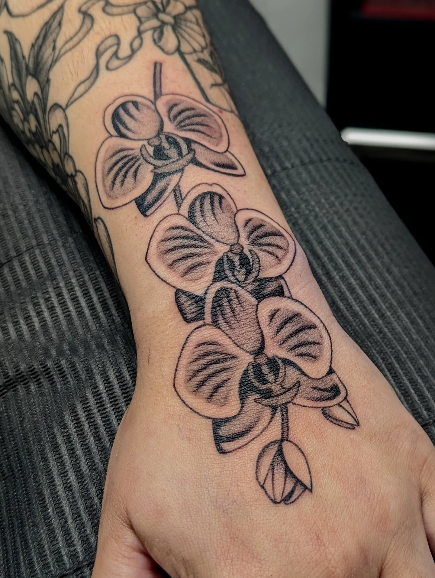 Placed directly on the hand, this orchid tattoo showcases bold outlines and detailed petal shading. Three blossoms flow down the hand, accompanied by a small bud, creating a vertical composition that draws the eye from wrist to fingers. Its balance of linework and shading makes it distinct and stylish.