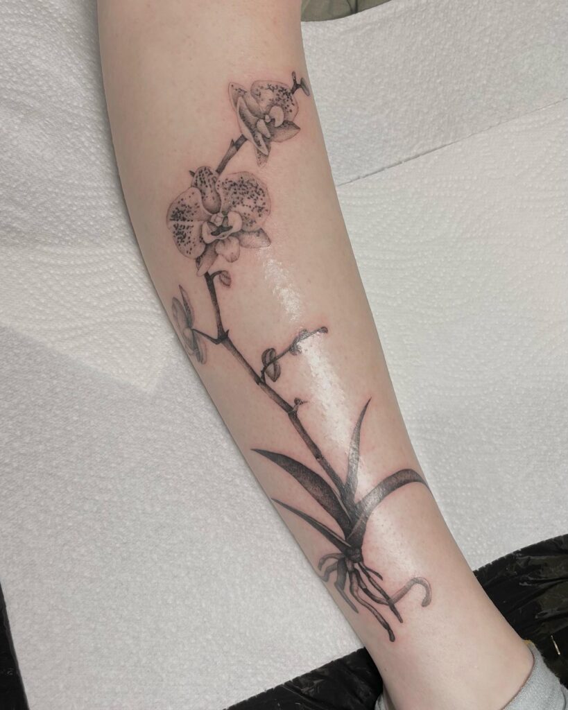 The monochrome palette allows the natural elegance of the orchids to stand out without distraction. Orchids here symbolize grace, resilience, and timeless beauty, making the tattoo a refined and meaningful choice. Its elongated placement along the arm adds flow, while the fine details ensure it remains visually striking both up close and at a distance.