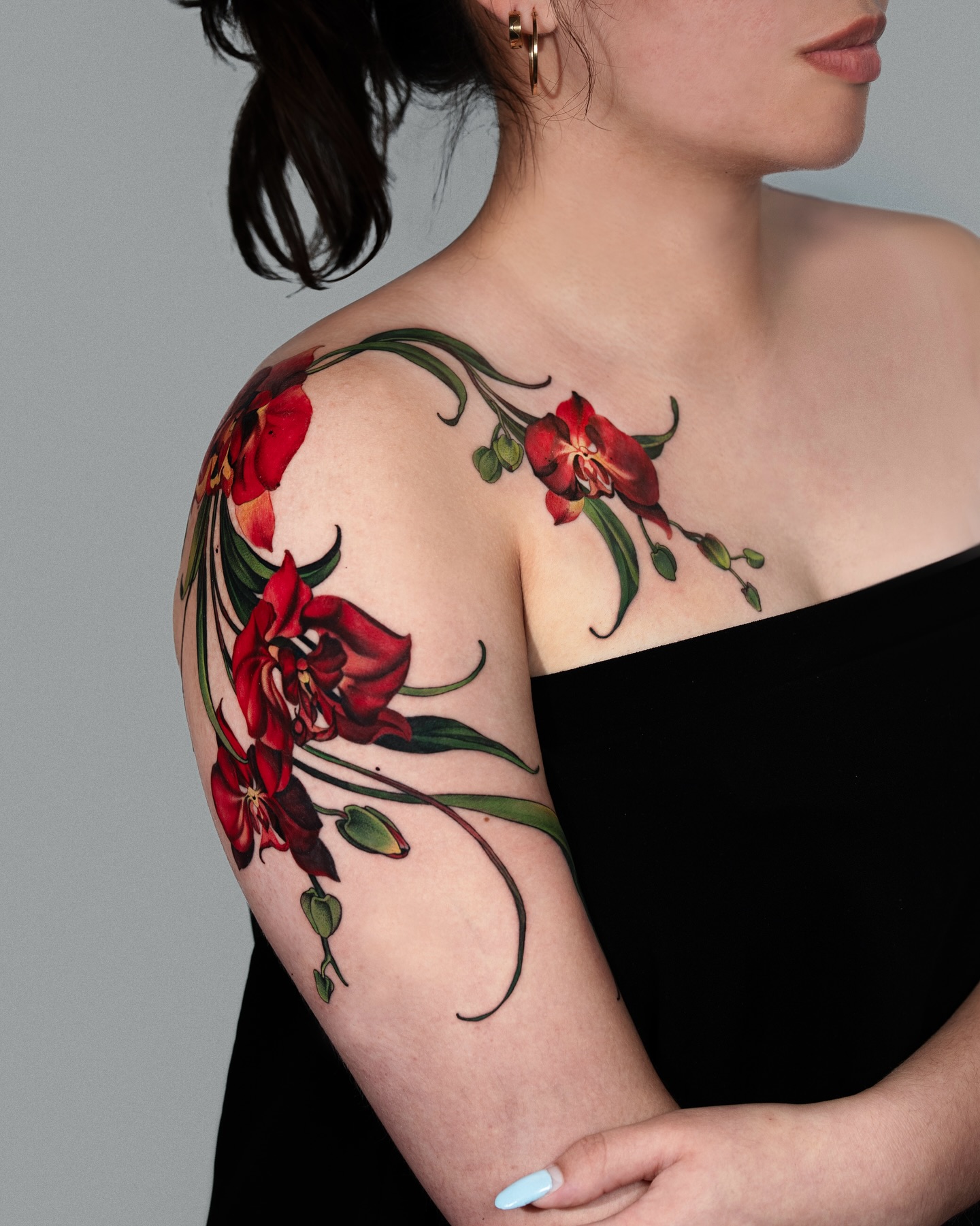 This stunning piece flows across the shoulder and down the arm, with vivid red orchids brought to life through rich color gradients. The blossoms are paired with long, green stems and unopened buds, creating a dynamic composition that enhances the body’s natural curves.