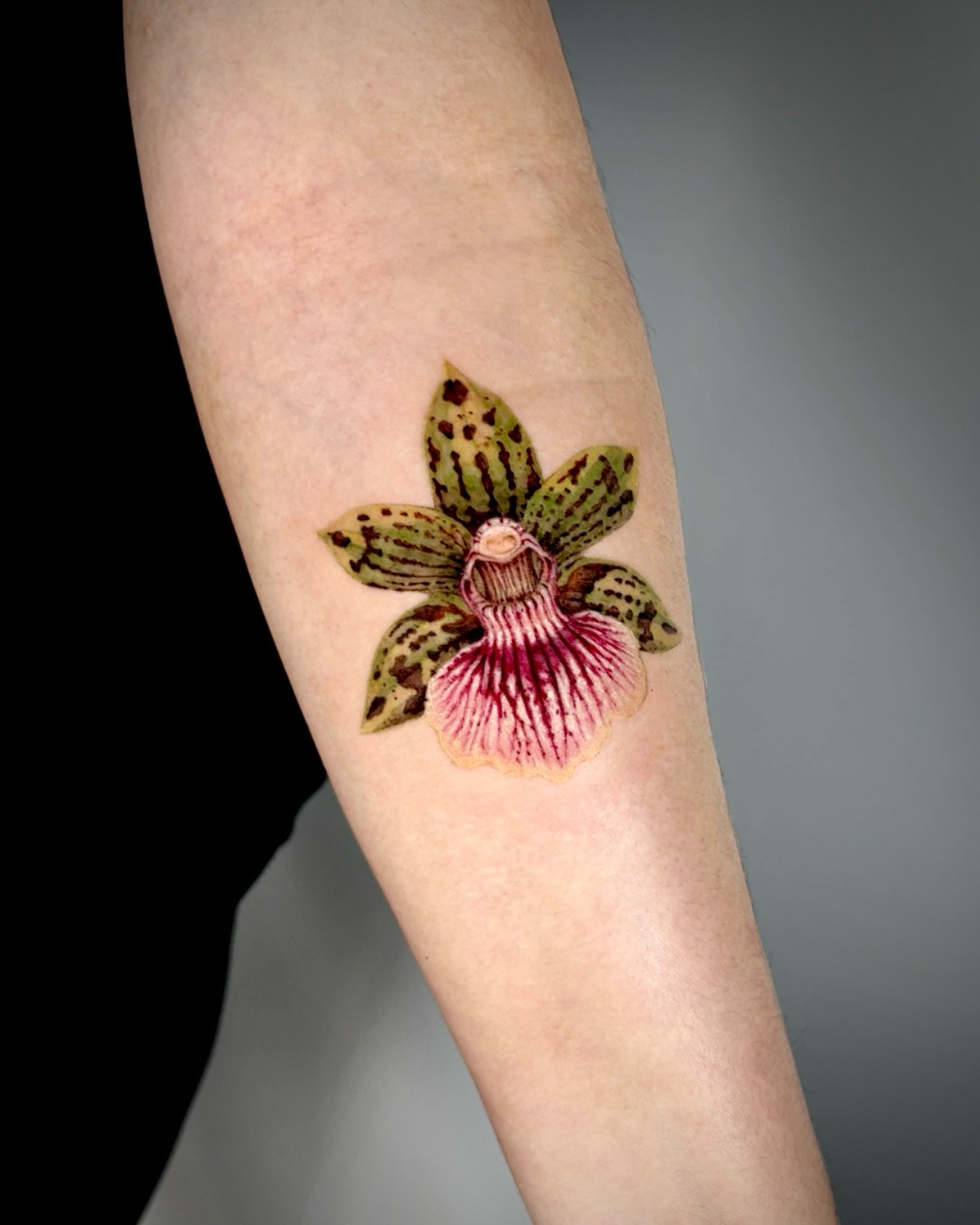 This tattoo captures a single orchid in vivid realism, with green speckled petals framing a bold pink and white center. The intricate details mimic the natural textures of this exotic flower, making it appear almost lifelike on the skin.