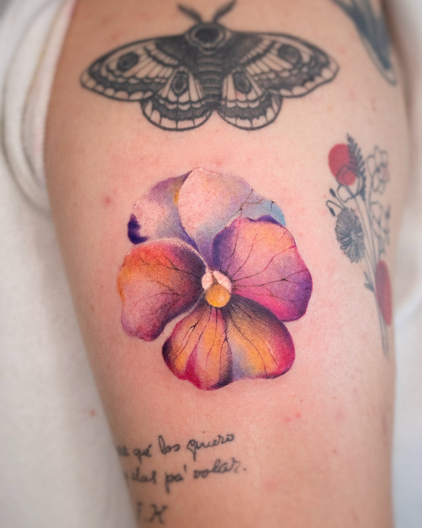 Watercolor orchids symbolize creativity, transformation, and freedom. The lack of heavy outlines enhances the softness and fluidity of the design, making it a vivid yet delicate tattoo. Placed on the upper arm, it stands out beautifully and blends seamlessly with surrounding tattoos, showcasing the wearer’s love for both floral elegance and artistic expression.