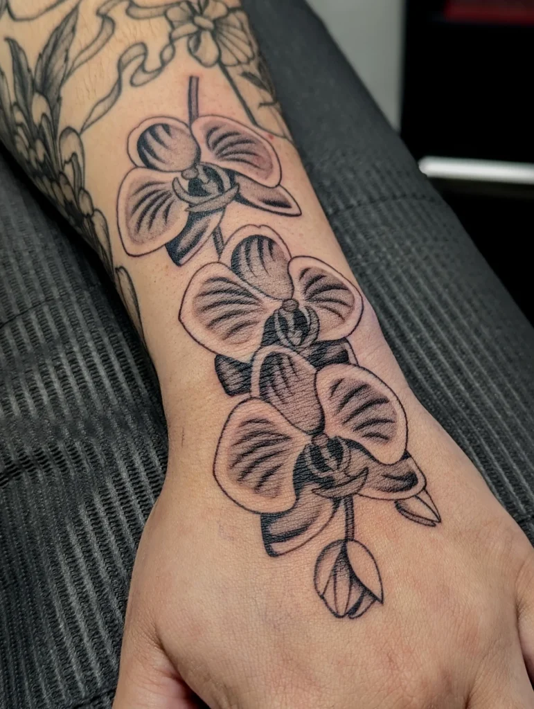 The design speaks to elegance, resilience, and a timeless love of nature. Orchids symbolize beauty, refinement, and strength, making this placement perfect for someone who wants their art visible yet graceful. The balance of detail and subtle shading ensures the tattoo blends seamlessly with other nearby floral tattoos, creating a harmonious body art composition.