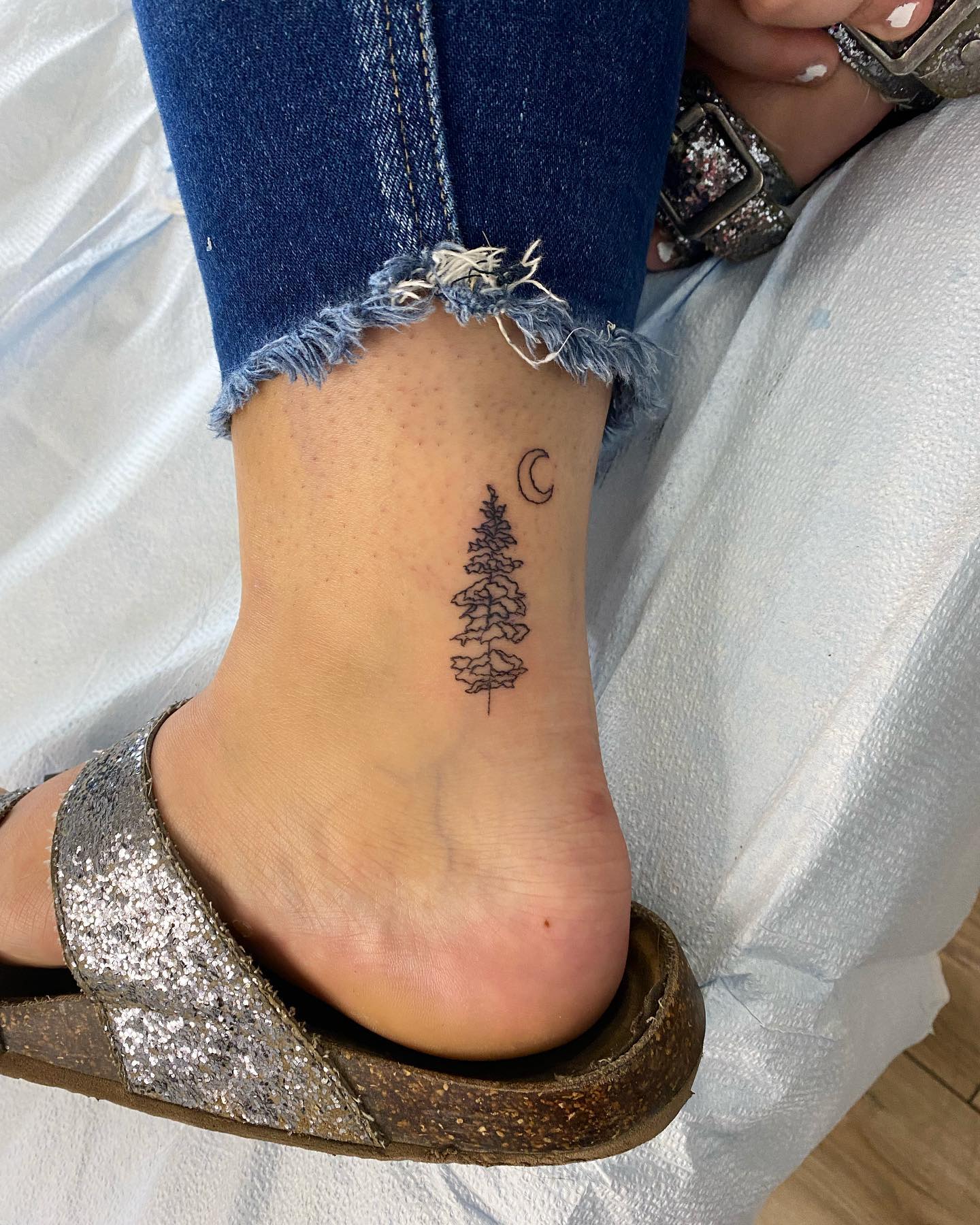 This delicate ankle tattoo features a slim pine tree outlined in black ink, paired with a small crescent moon above. The fine lines keep the design clean and minimal, making it subtle yet deeply expressive. Its small size allows it to sit gracefully on the ankle, blending nature-inspired imagery with celestial symbolism.