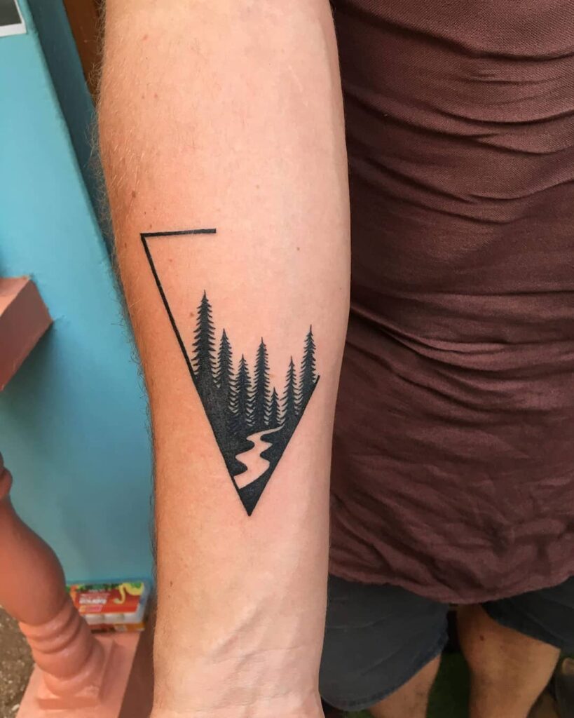 For women, this tattoo represents the journey of life, where structure and spontaneity coexist. The triangle suggests balance and strength, while the river within the forest reflects fluidity and change. This piece is ideal for those who want their tattoo to symbolize adventure, transformation, and harmony between nature and modernity.