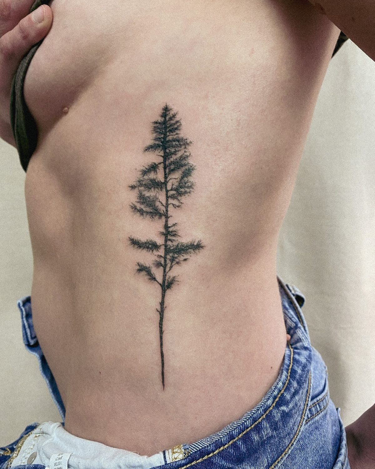This rib tattoo features a tall, slender pine tree inked with soft shading. The placement along the side of the torso enhances the body’s curves, making the tattoo both elegant and striking. Its fine details mimic the natural form of pine branches, stretching upward in a graceful design.