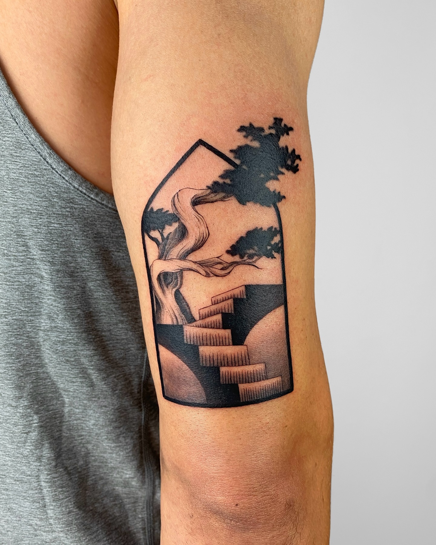 This imaginative tattoo features pine trees framed within a window-like shape, paired with a staircase that seems to lead into another world. The shading is bold, with careful gradients adding depth and mystery. The twisted branches give it an otherworldly, dreamlike quality.