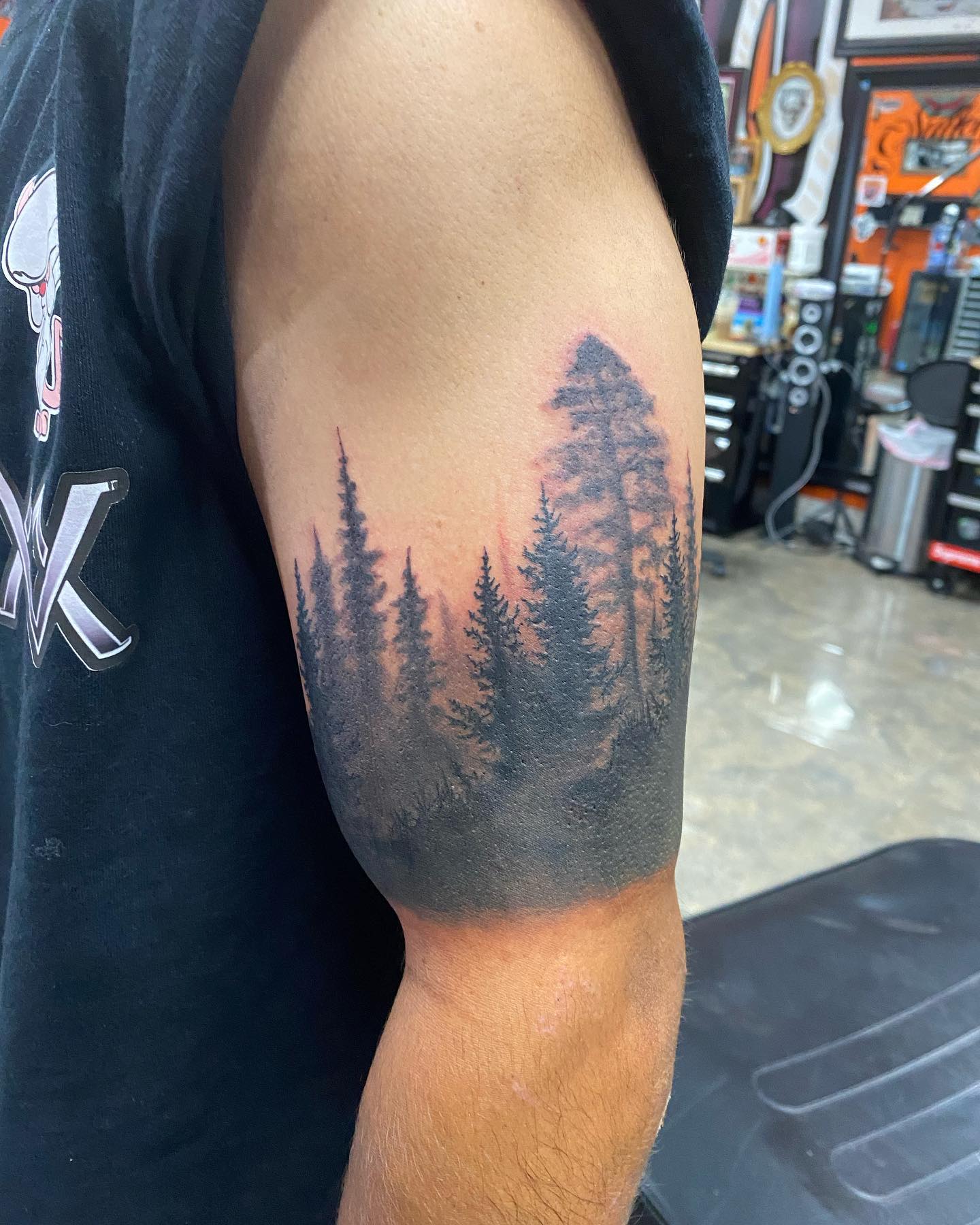 This tattoo spans the arm with a stunning forest scene. A collection of tall pine trees is rendered in deep black shading, fading into the background with a misty effect. The layered design creates a sense of depth, as though you’re looking into a real forest at dusk.