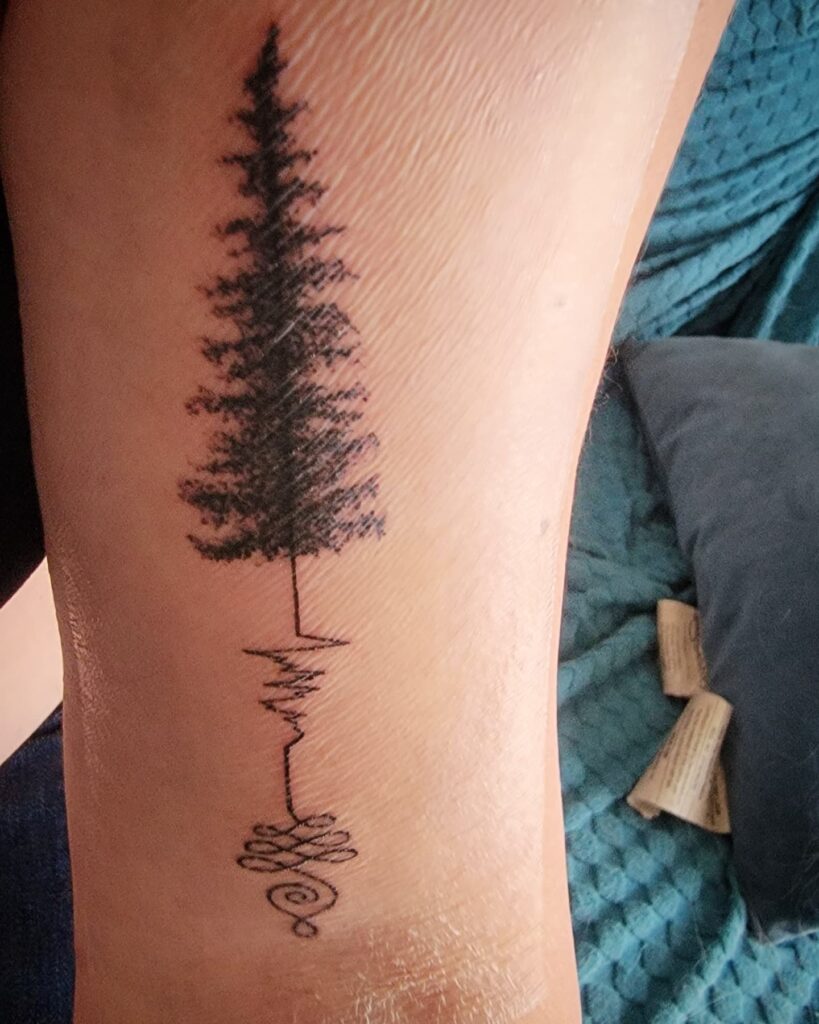 This tattoo combines a tall pine tree with a heartbeat line, ending in a decorative flourish. The shading of the tree contrasts with the thin linework of the heartbeat, creating a design that’s both symbolic and visually appealing. It blends minimalism with deeper meaning.