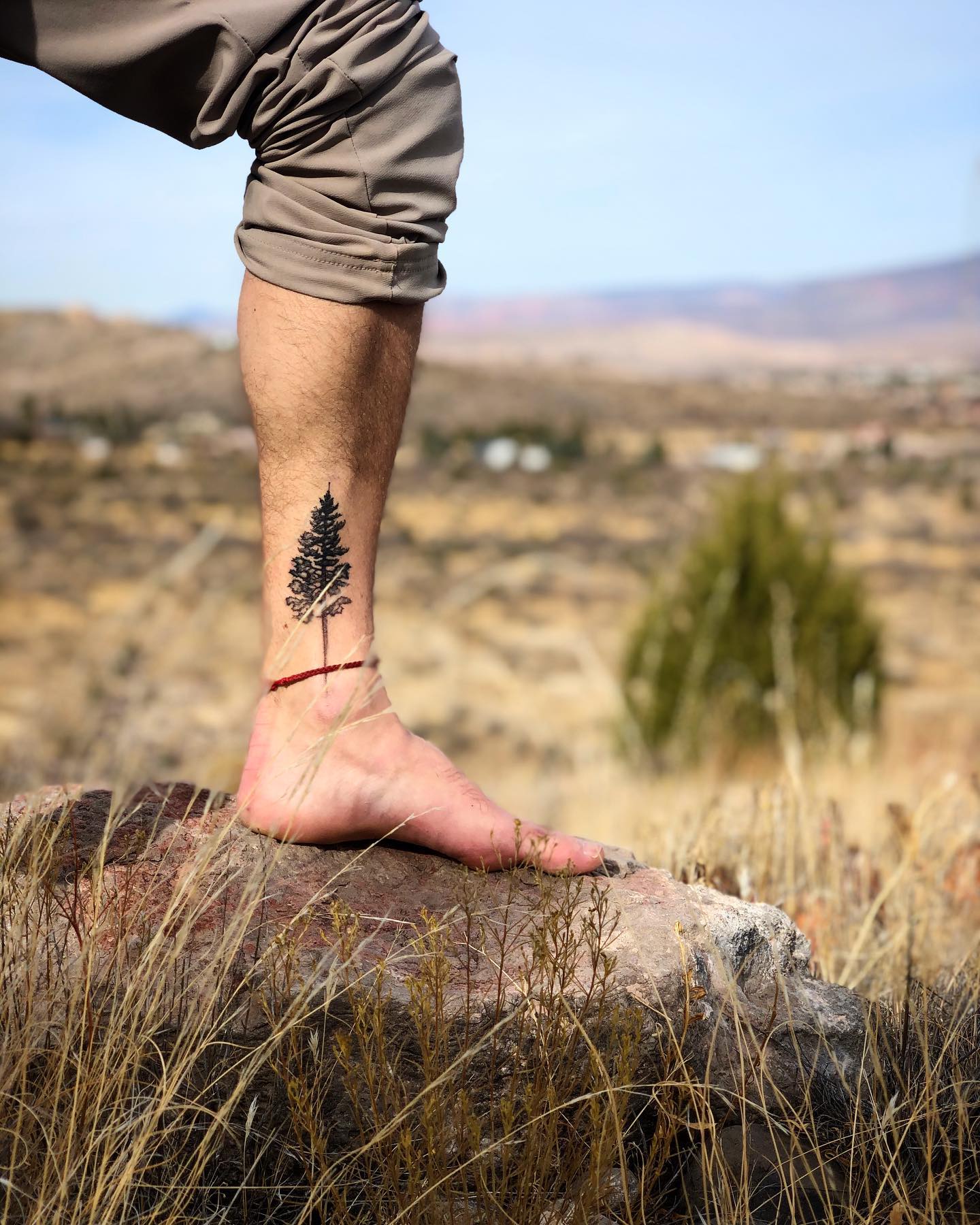 This tattoo depicts a finely detailed pine tree on the ankle, captured in a natural outdoor setting. Its delicate shading highlights the branches, while its placement elongates the leg subtly and stylishly. The minimalist design ensures it remains timeless.