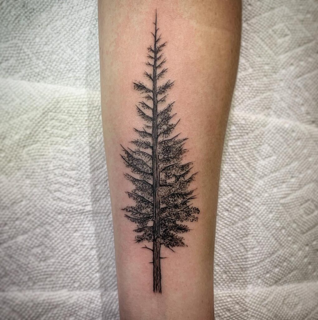 This striking tattoo presents a tall, solid black pine tree etched onto the arm. The tree’s trunk is long and steady, leading up to detailed branches that spread wide in a natural silhouette. The artist uses dense shading to give the tattoo weight and depth, emphasizing its powerful and grounded presence.