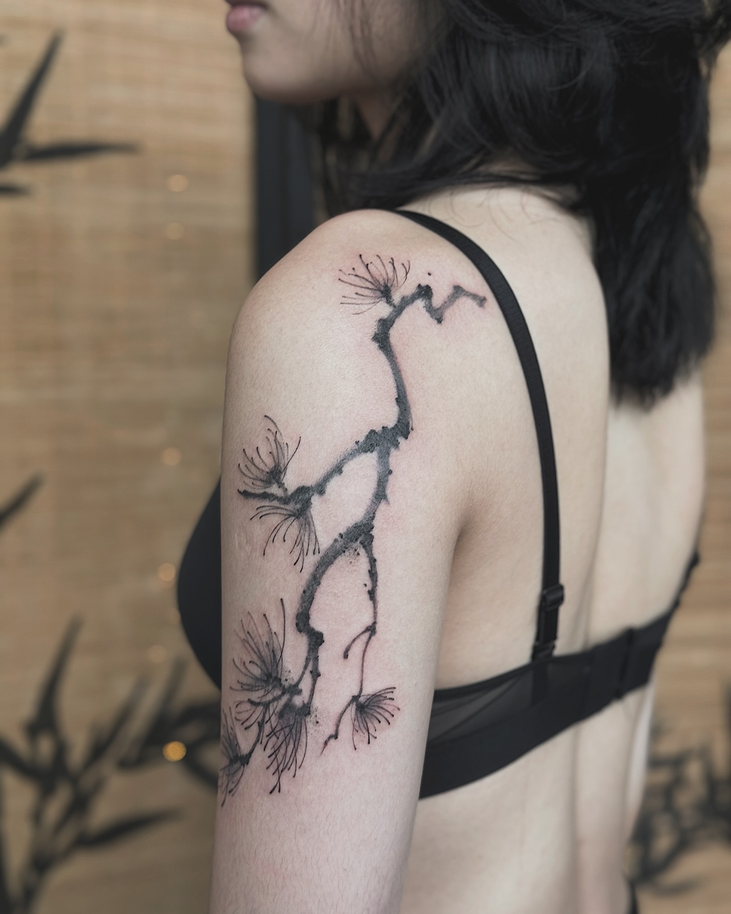 This tattoo captures a pine branch with expressive brushstroke-like shading across the shoulder and upper arm. Its artistic execution gives the design a watercolor or ink-painting effect, blending natural realism with abstract creativity. The flowing shape enhances the curve of the arm beautifully.