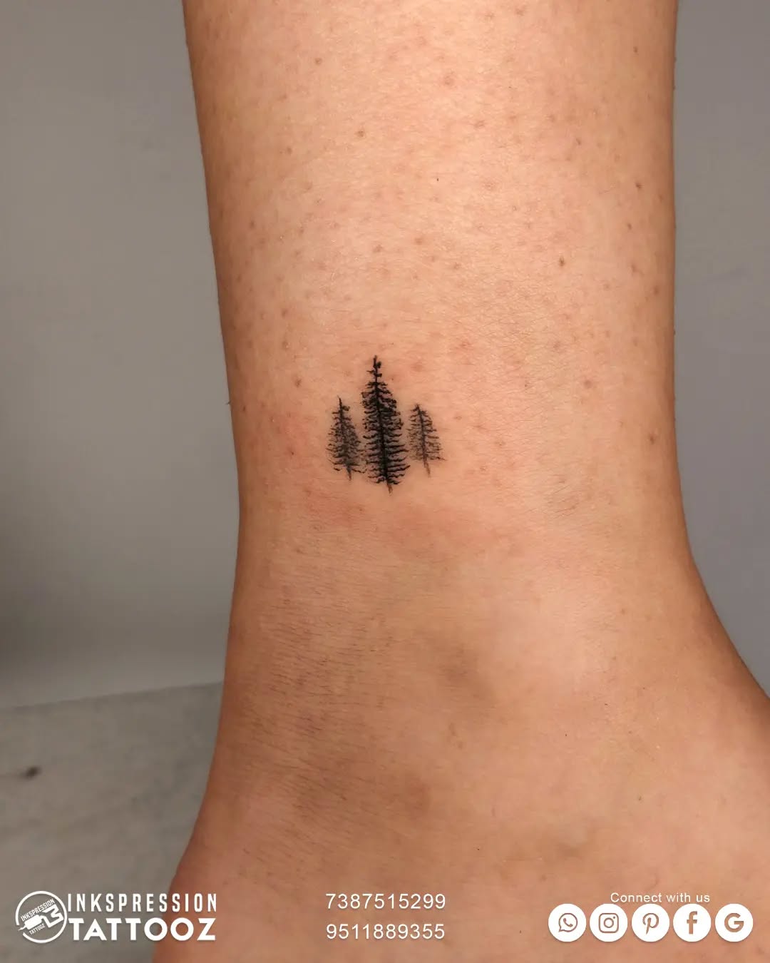 This delicate tattoo depicts three pine trees of varying sizes inked in fine black lines. The design is minimal yet expressive, emphasizing balance and simplicity. Placed on the ankle, it remains subtle and stylish, making it perfect for everyday wear.