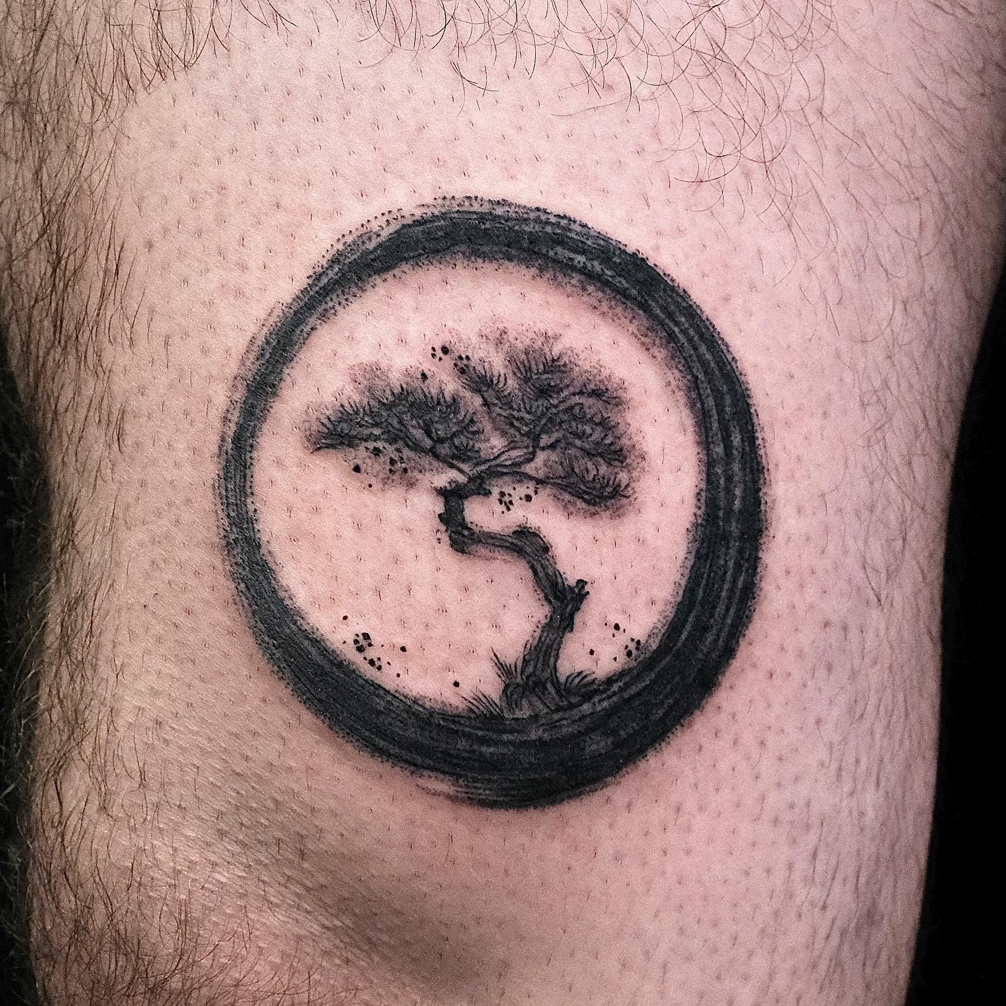 This tattoo features a windswept pine tree encased within a bold Zen circle. The brushstroke-like texture of the circle contrasts beautifully with the delicate tree inside, giving the design both strength and serenity. Its placement on the skin highlights its round composition and balanced form.