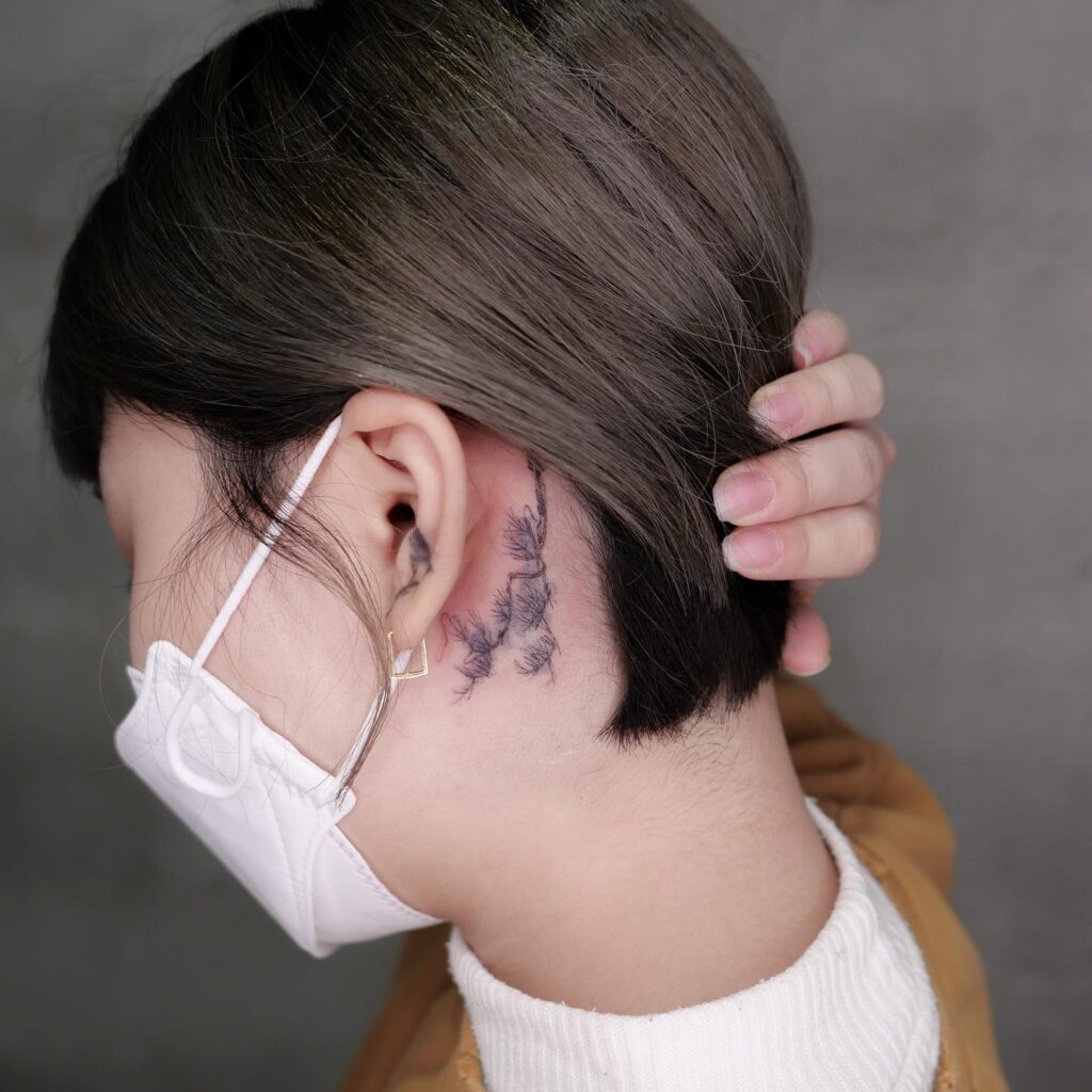 This subtle tattoo depicts a delicate pine branch inked just behind the ear. Its soft lines and fine shading make it discreet yet visually captivating. The placement gives it an intimate charm, only revealed when the hair is tucked aside.