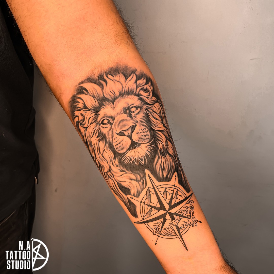 This forearm tattoo beautifully merges a majestic lion with a compass, symbolizing courage, leadership, and guidance. The lion’s detailed mane and piercing eyes radiate strength, while the compass grounds the design with direction and purpose.