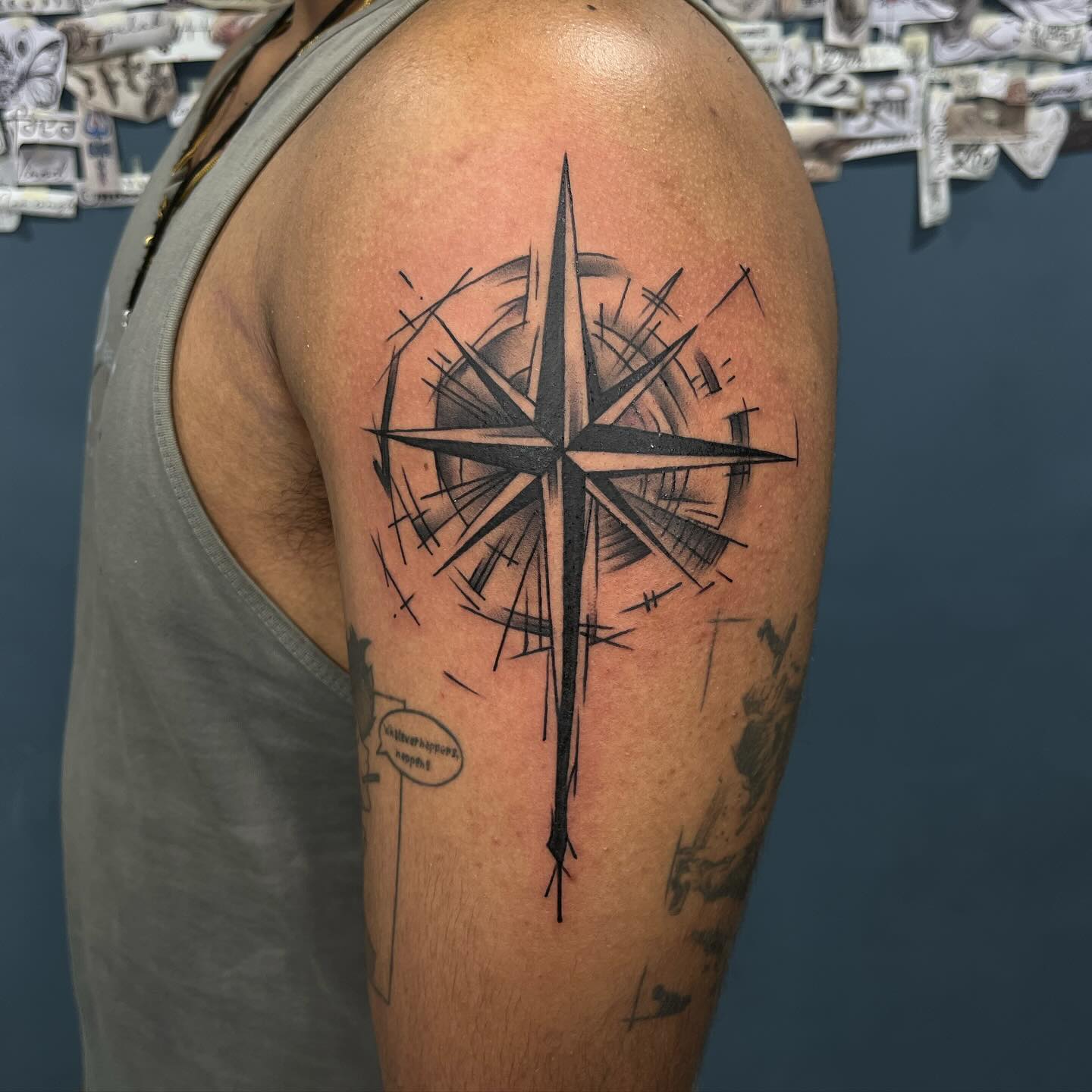 This tattoo features a sketch-style compass with rough, dynamic lines that give it an artistic, almost hand-drawn feel. The shading adds depth, making the compass appear like it’s in motion, which symbolizes a constant search for direction in life.
