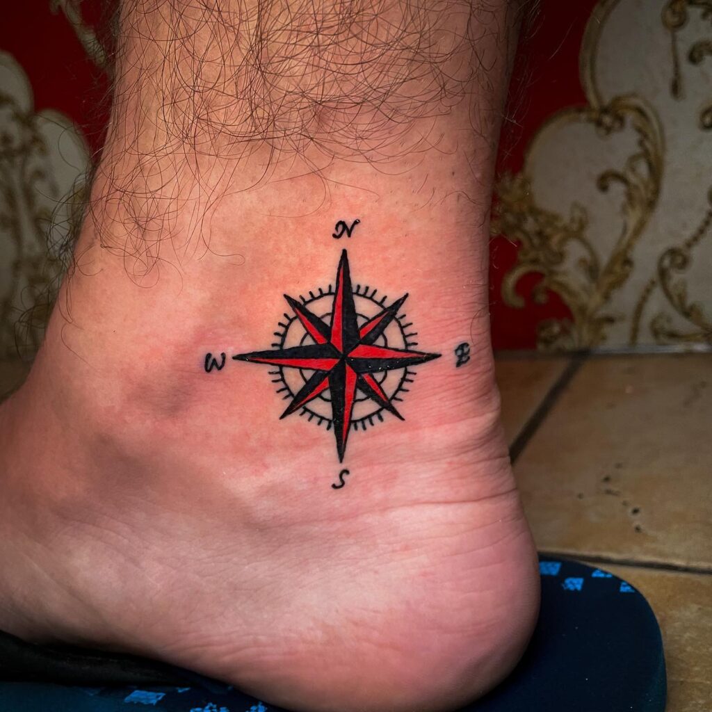This ankle tattoo uses a striking red-and-black color scheme to make the compass pop. The four cardinal directions are clearly marked, giving it a bold, nautical look. Its small size makes it perfect for someone who wants a meaningful yet subtle design.