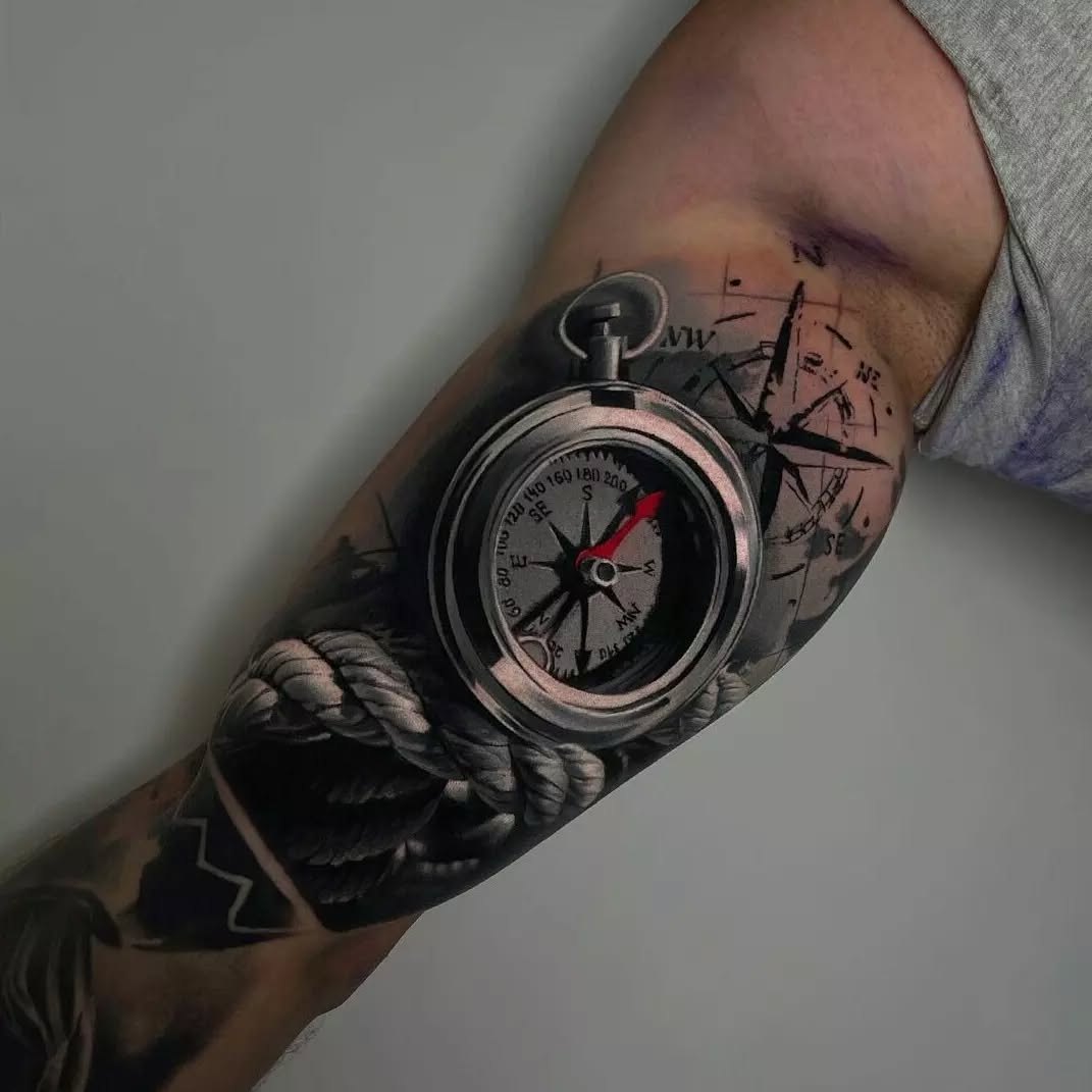 This hyper-realistic bicep tattoo features a detailed compass with a shiny metallic finish and a rope intertwined below it, creating a bold nautical vibe. The compass looks three-dimensional, with a vibrant red needle pointing the way. The background includes faint map-like lines, tying in the theme of navigation and exploration.