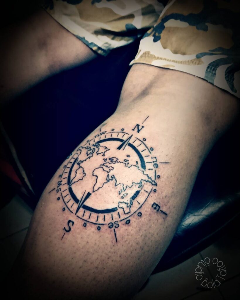 It’s a perfect tattoo for globetrotters who want to carry a piece of their wanderlust with them wherever they go. The fine lines and balanced shading give it a classic yet personal look.