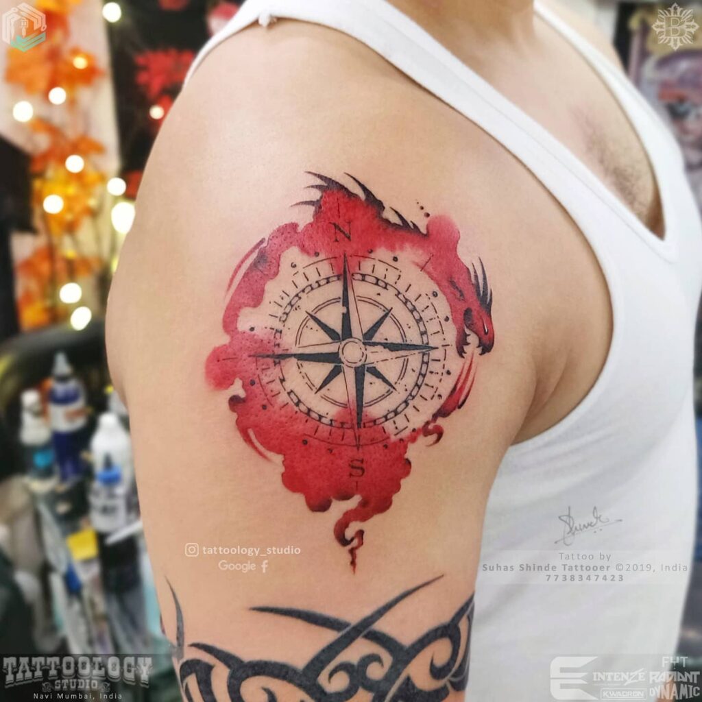 This eye-catching shoulder tattoo uses a fiery red ink splash as the backdrop for a black compass, making it dramatic and unique. The dragon silhouette hidden within the red adds an element of strength, mystery, and power.