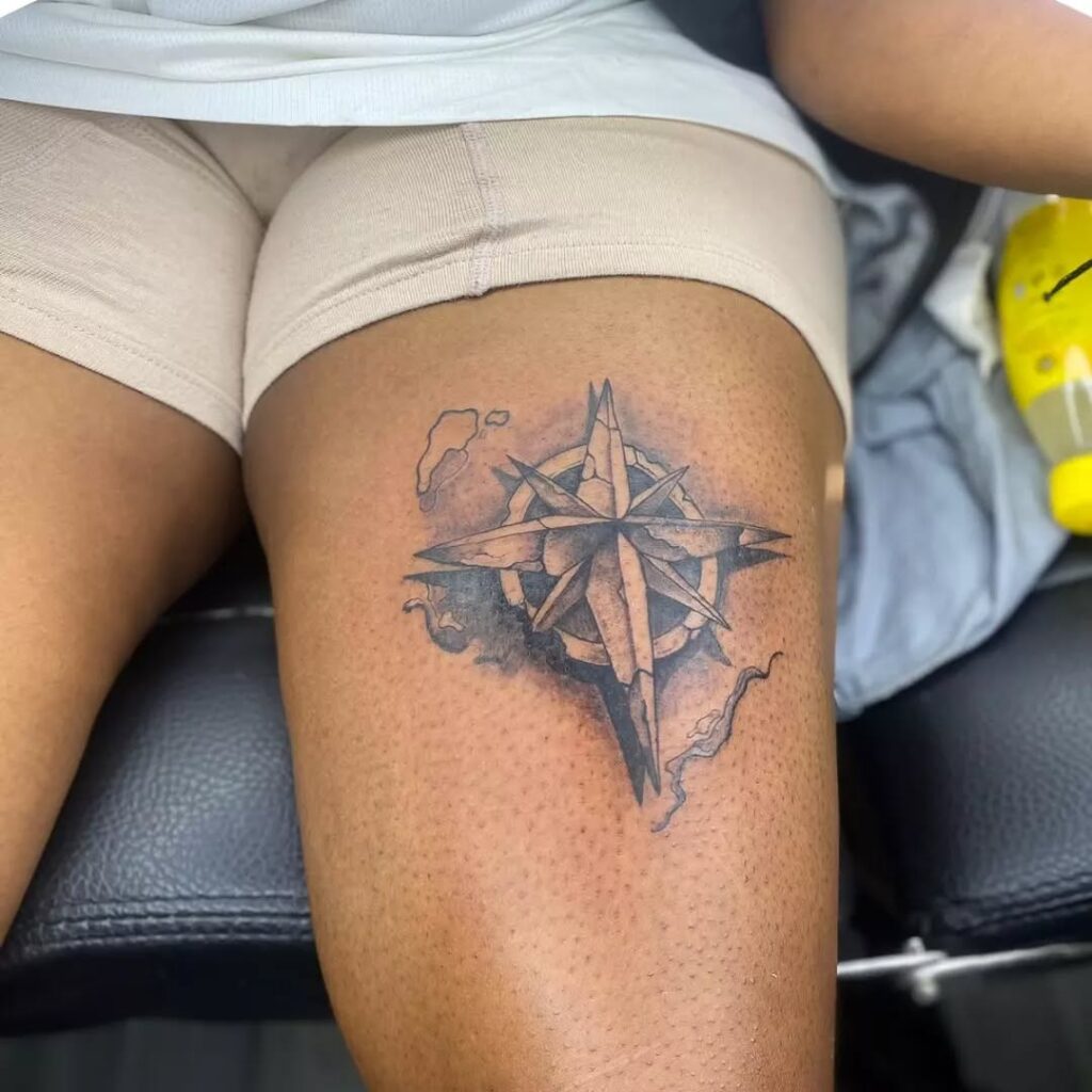 This thigh tattoo features a bold compass design with a unique wooden texture effect, giving it a rugged, handcrafted look. The subtle shading adds depth, making the compass points appear three-dimensional, as though they are carved into the skin. Its slightly weathered appearance symbolizes resilience and enduring guidance through life’s storms.