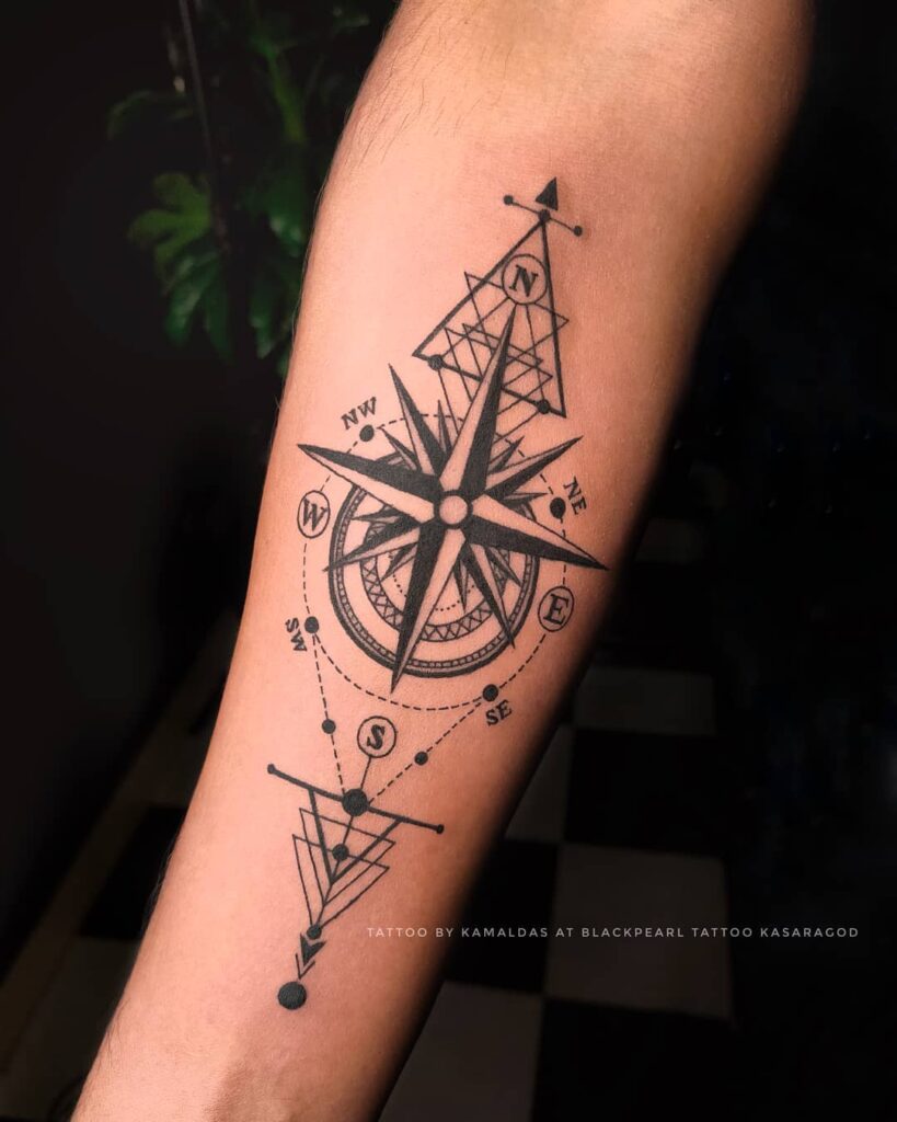 This forearm tattoo combines a classic compass with geometric patterns and fine dotwork, giving it a futuristic and symbolic appearance. The connecting lines and shapes represent pathways and choices, turning it into a piece of art about life’s journey.