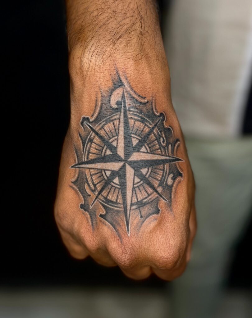 This striking compass tattoo covers the top of the hand with a sharp, symmetrical design that feels powerful and directional. The bold black ink with soft shading creates a sense of depth, making the compass look almost three-dimensional. Its placement on the hand symbolizes always being guided, no matter what path life takes you on.