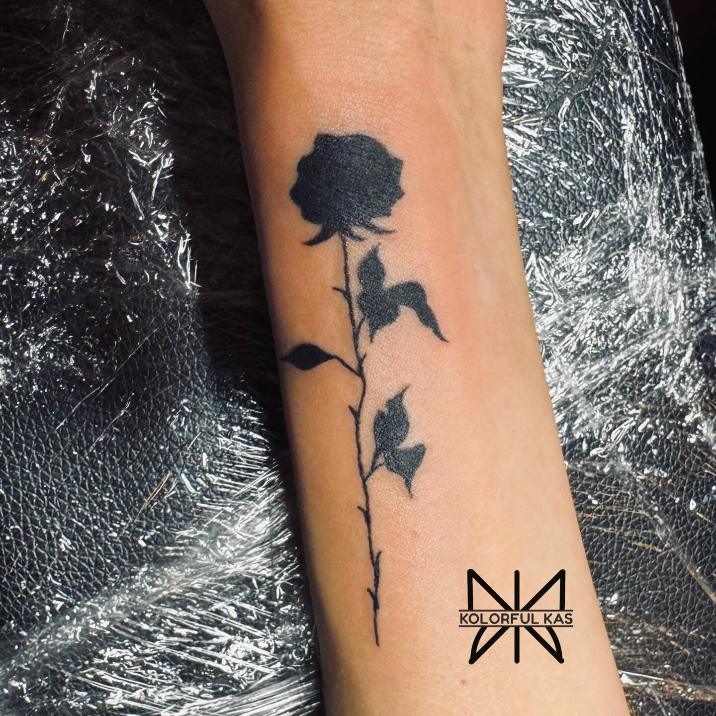 This tattoo showcases a delicate single-line silhouette of a rose, with a slim stem and small leaves for a clean and minimal look. Its solid black fill creates a bold contrast while keeping the design simple and understated.