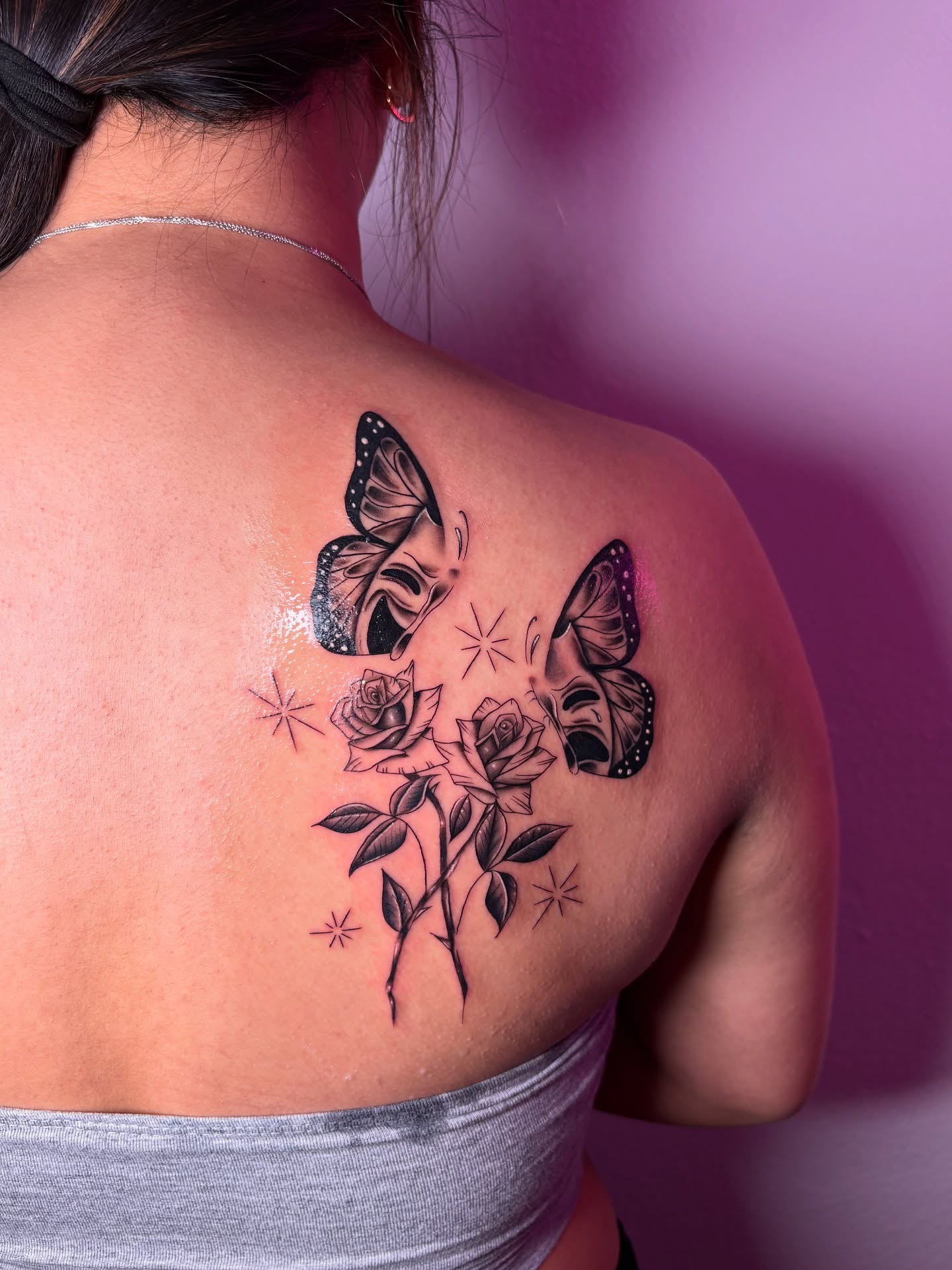 This beautiful back tattoo combines two roses with two detailed butterflies, framed by subtle star accents. The fine linework and soft shading give it a dreamy, feminine aesthetic that flows naturally across the upper back.