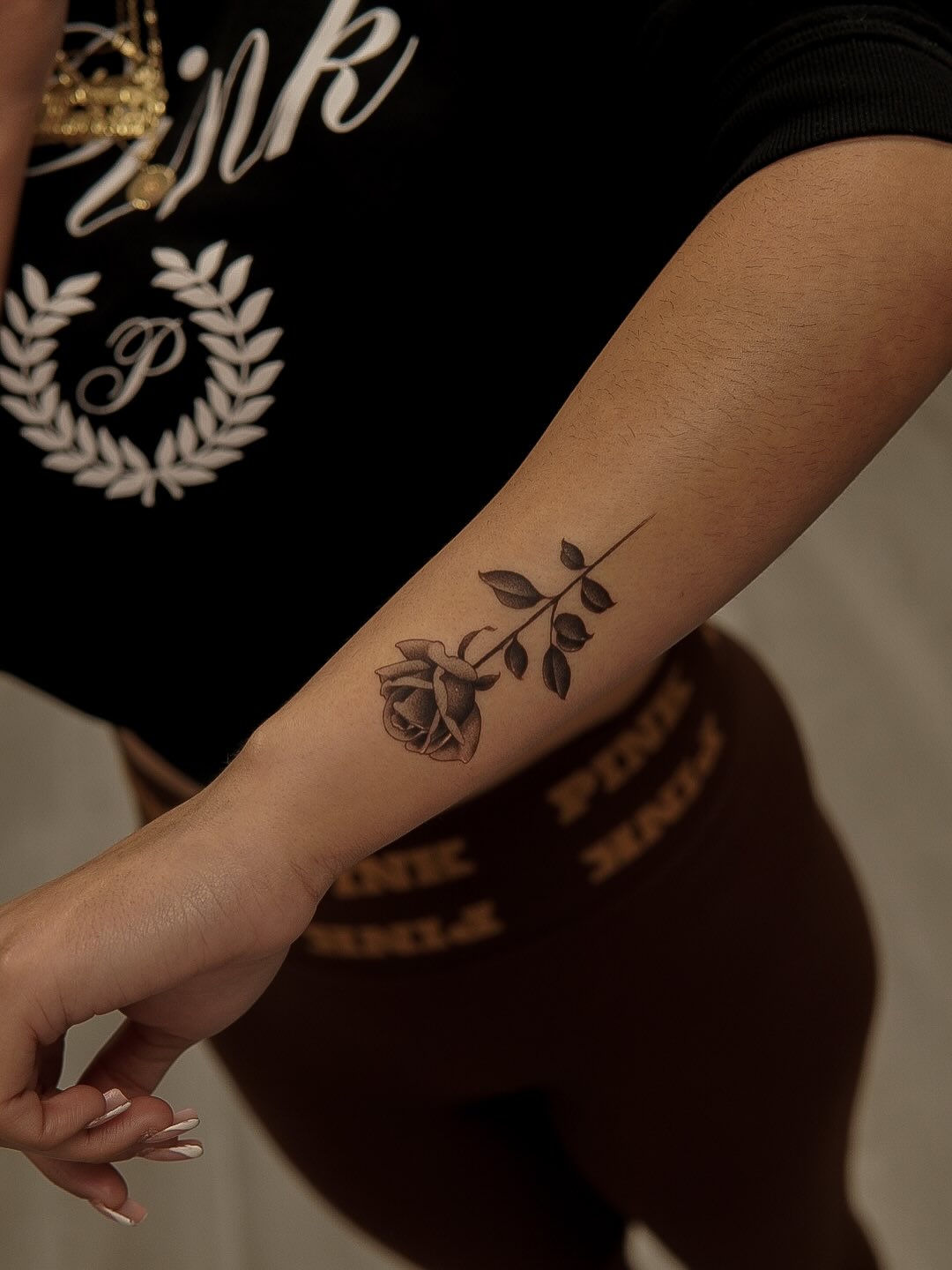 Minimalist rose tattoos like this one often symbolize quiet beauty, growth, and resilience. Its placement along the forearm makes it easy to show off while maintaining a subtle and sophisticated vibe, perfect for someone who loves elegance in its simplest form.