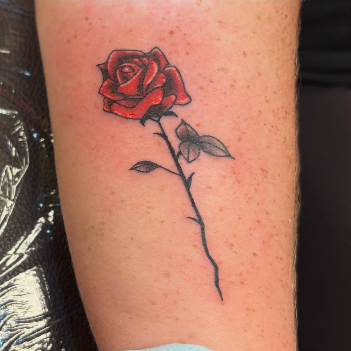 This design features a beautiful red rose with a slim stem and fine leaves, giving it a timeless, romantic appearance. The deep red shading contrasts beautifully with the black linework, making it pop against the skin.
