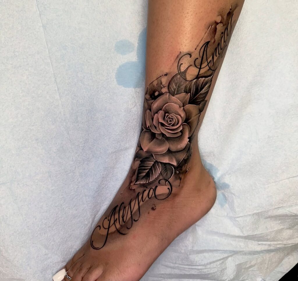 Roses combined with names or meaningful words can serve as a tribute or memorial. This placement around the ankle and foot makes it both intimate and stylish, a beautiful way to carry personal memories wherever you go.