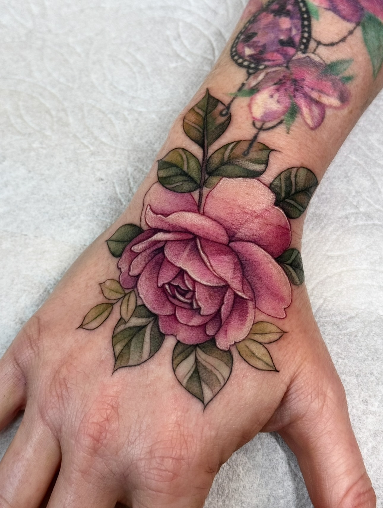 Pink roses often symbolize grace, admiration, and gratitude. A placement on the hand makes this tattoo a daily reminder of those values, perfect for someone who wants a visible, feminine, and meaningful floral piece.