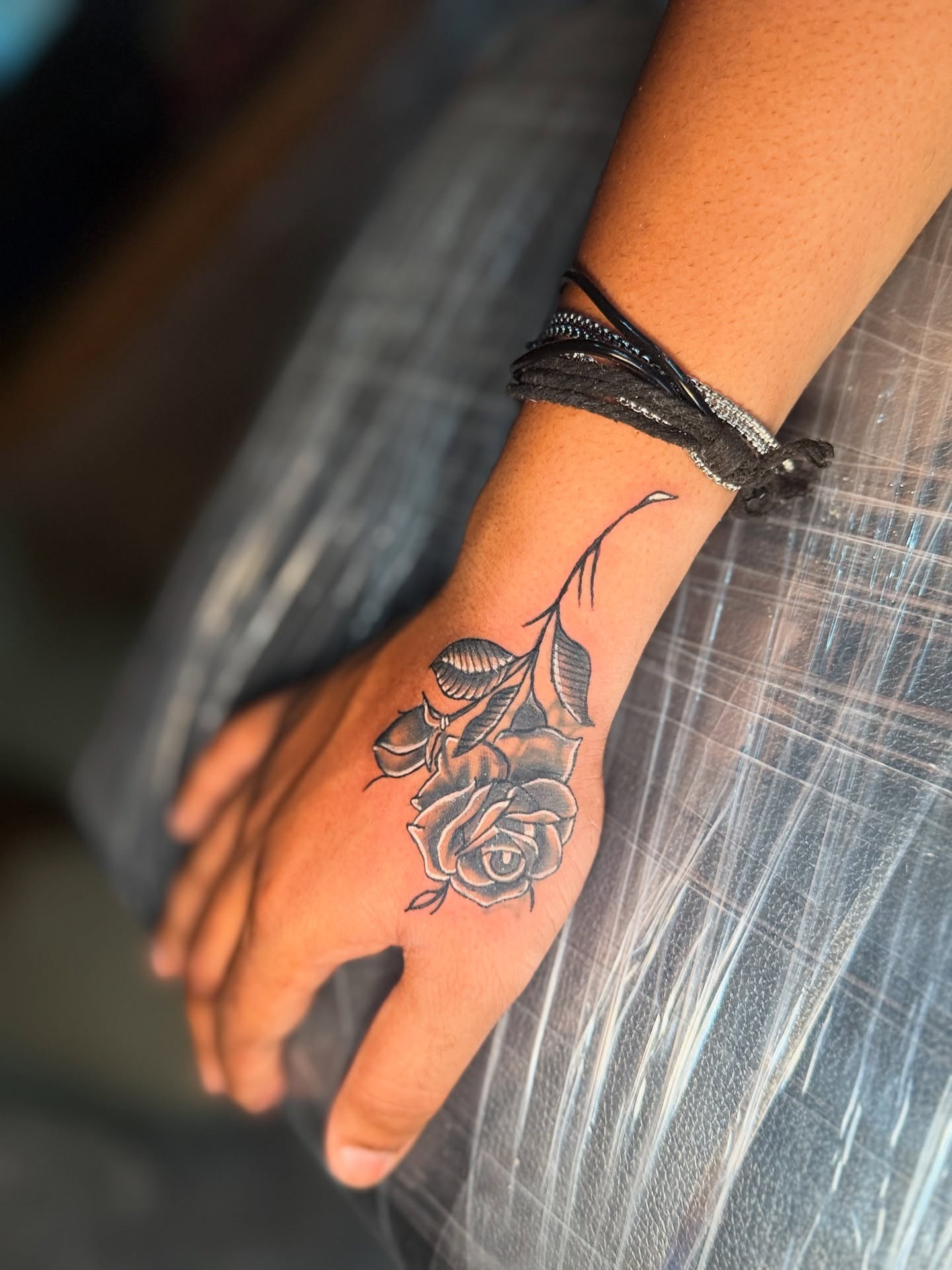 A rose on the hand can symbolize strength, beauty, and commitment. This design is perfect for those who want a meaningful tattoo that stands out while blending harmoniously with other future pieces or jewelry.