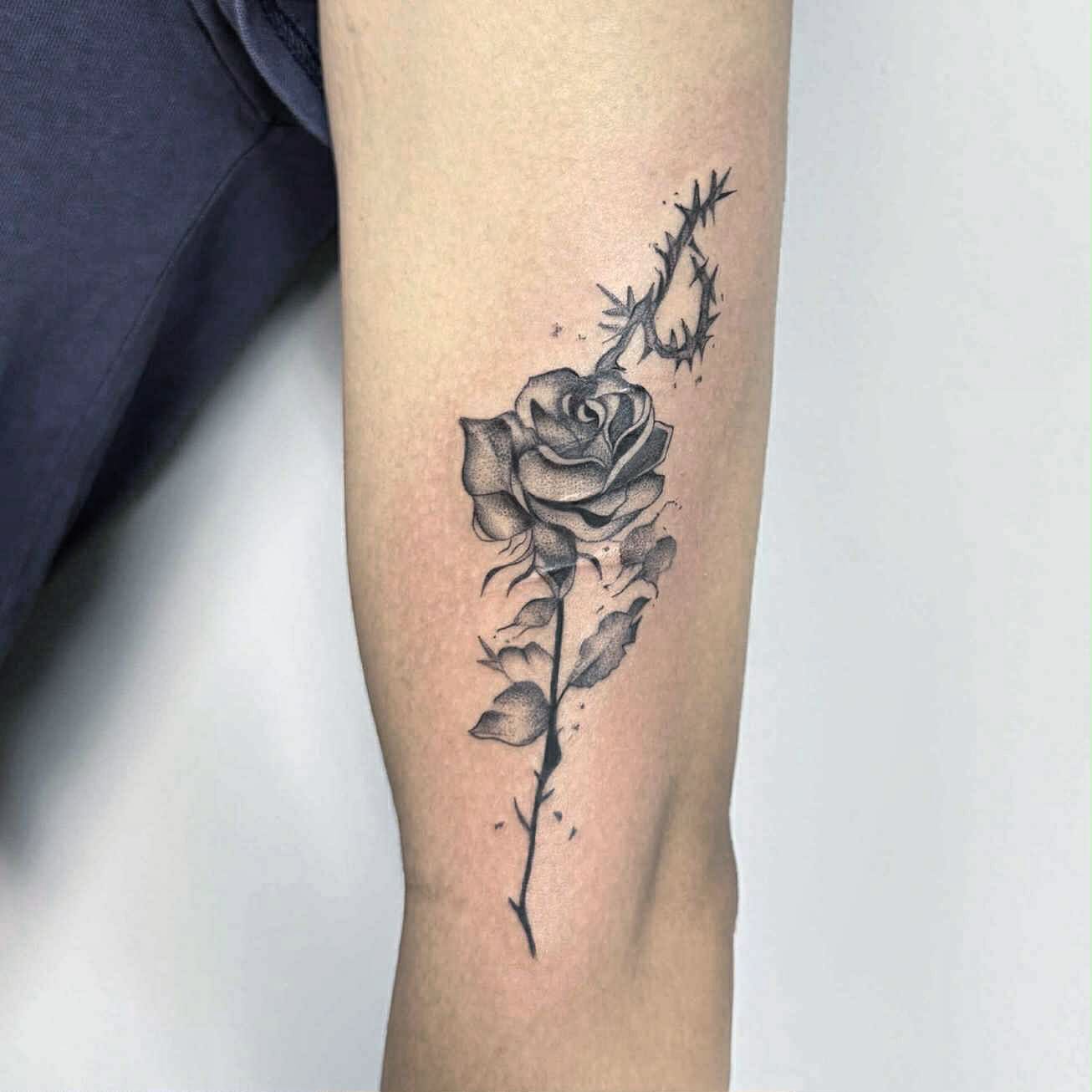 This forearm tattoo is a stunning example of fine-line artistry, featuring a single rose with detailed petals and slender stem. The soft shading gives the rose a realistic yet subtle feel, making it ideal for those who want an elegant, delicate piece.