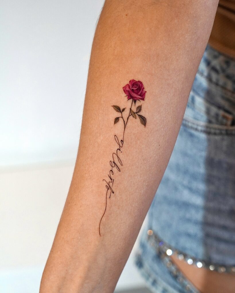 This design combines a delicate red rose with a flowing script that runs vertically down the forearm. The fine line stem seamlessly blends into the word, giving the tattoo a graceful, continuous look.