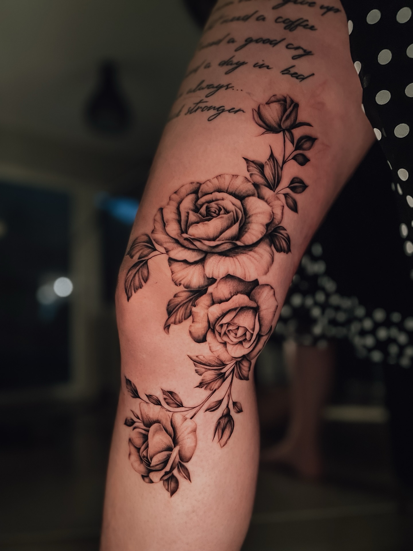 This piece displays three beautifully shaded roses cascading down the thigh, accompanied by leaves and buds for a natural flow. The detailed linework and soft shading create a realistic effect, turning the leg into a living canvas.