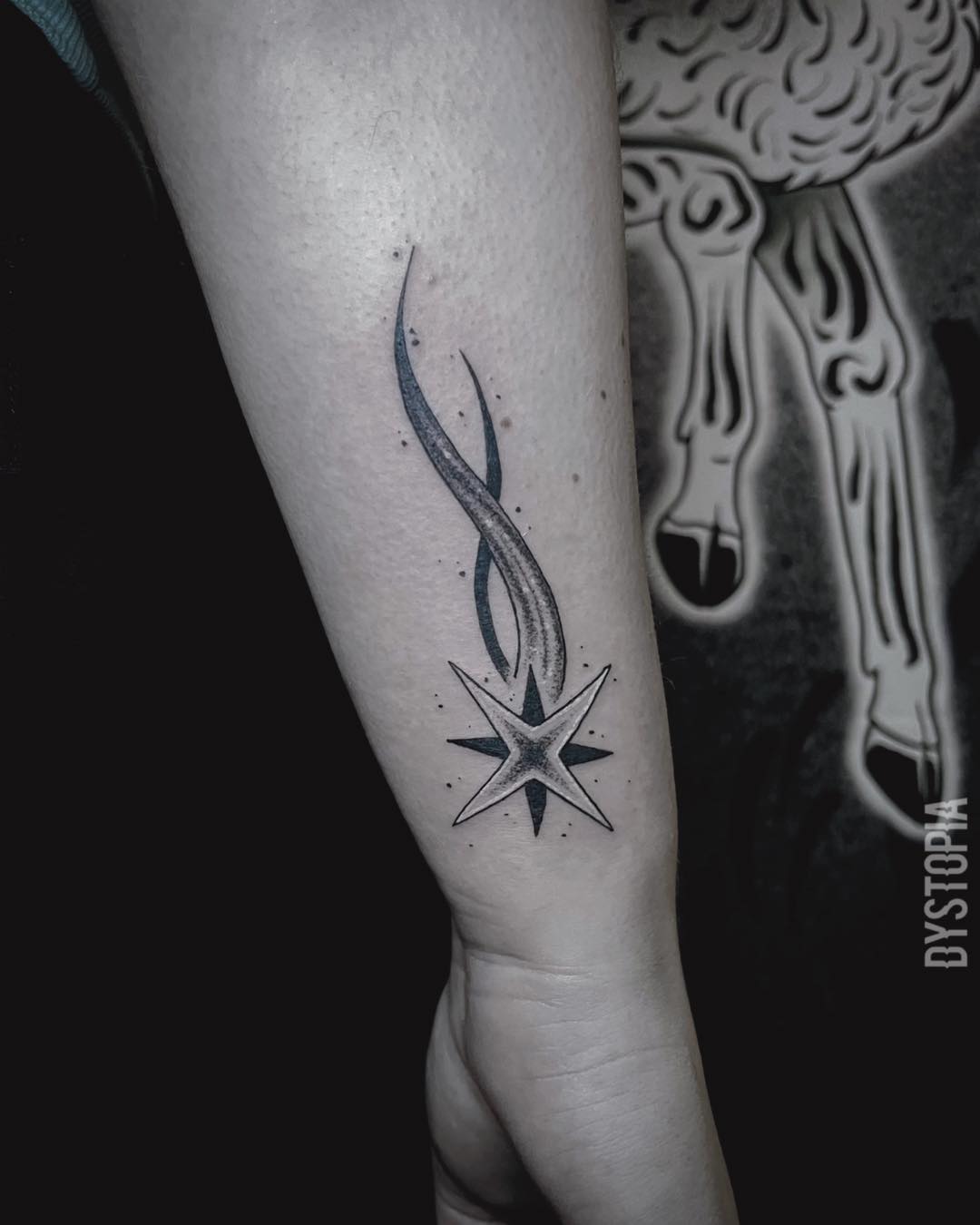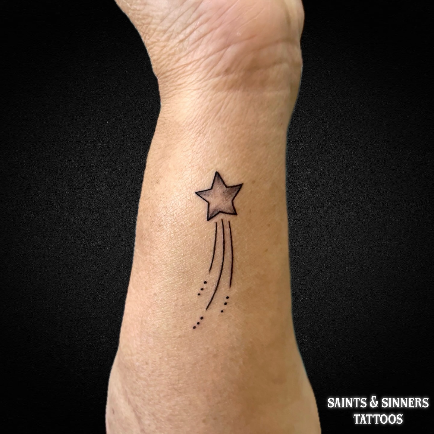 This wrist tattoo features a clean star shape with three trailing lines and dotted accents. The simplicity of the design makes it timeless and versatile, ideal for those who love minimalist body art.